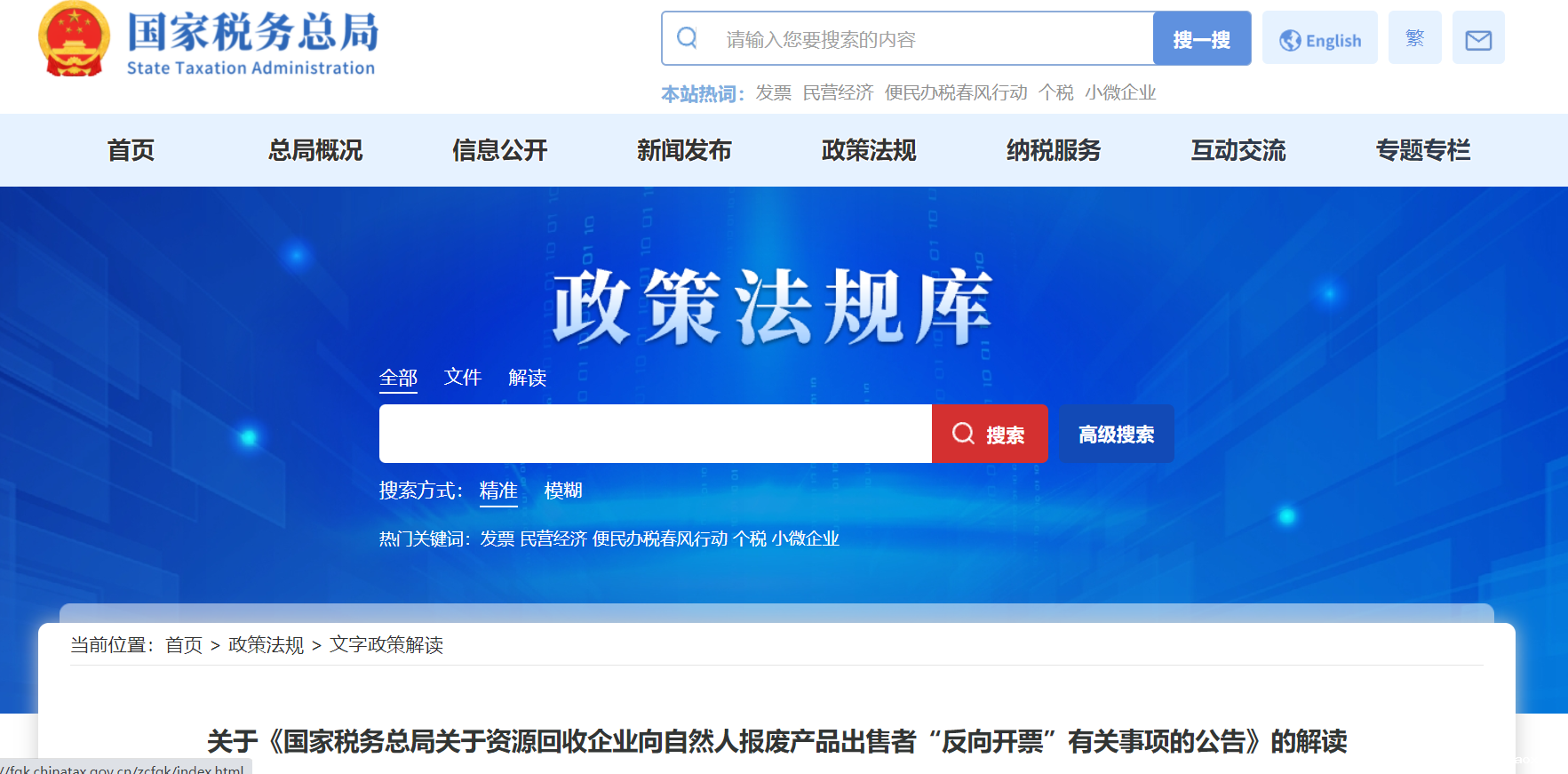 税务总局发布公告明确资源回收企业“反向开票”实施办法